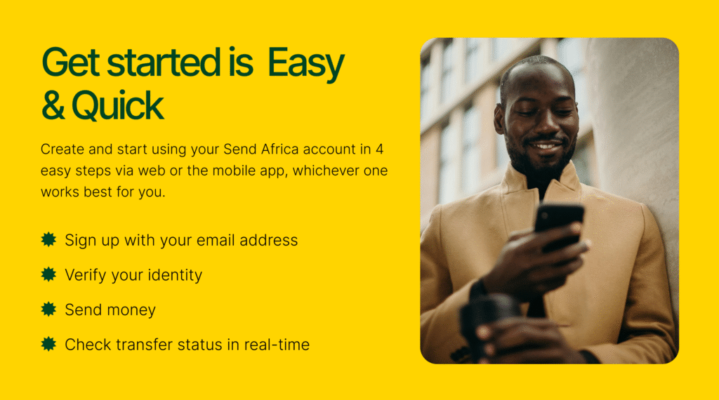 We make sending money internationally easier and faster than ever. Send Africa enables you to transfer money instantly. There are no long waiting periods or extra steps.